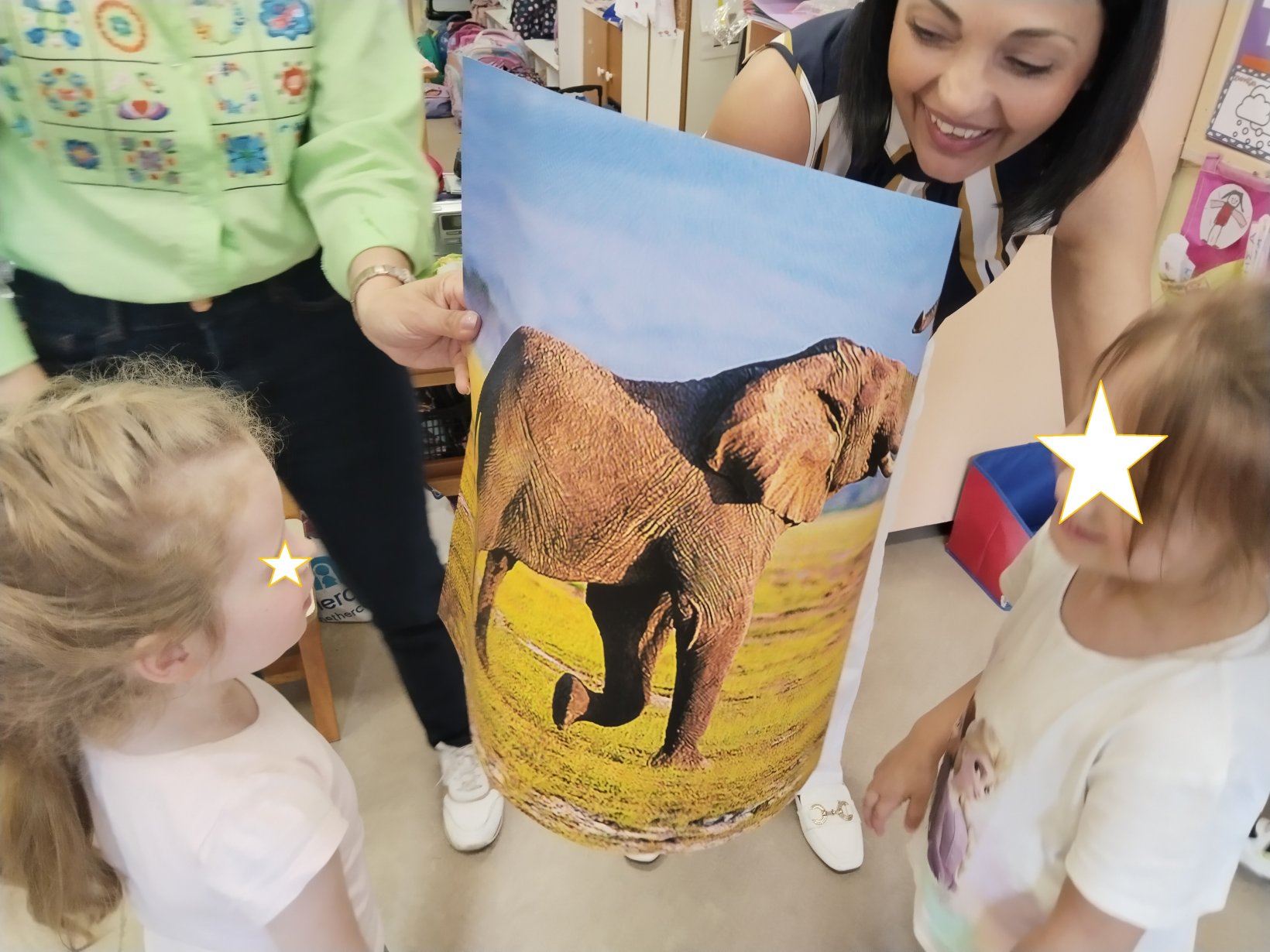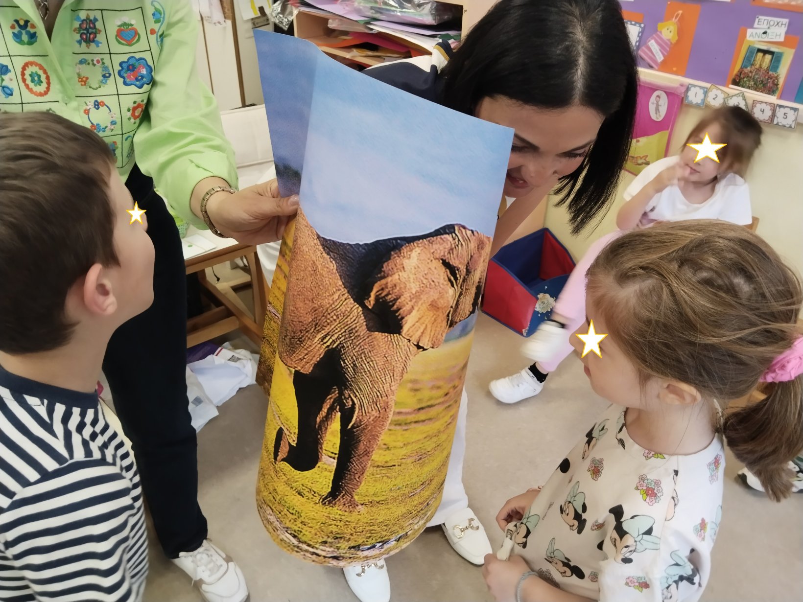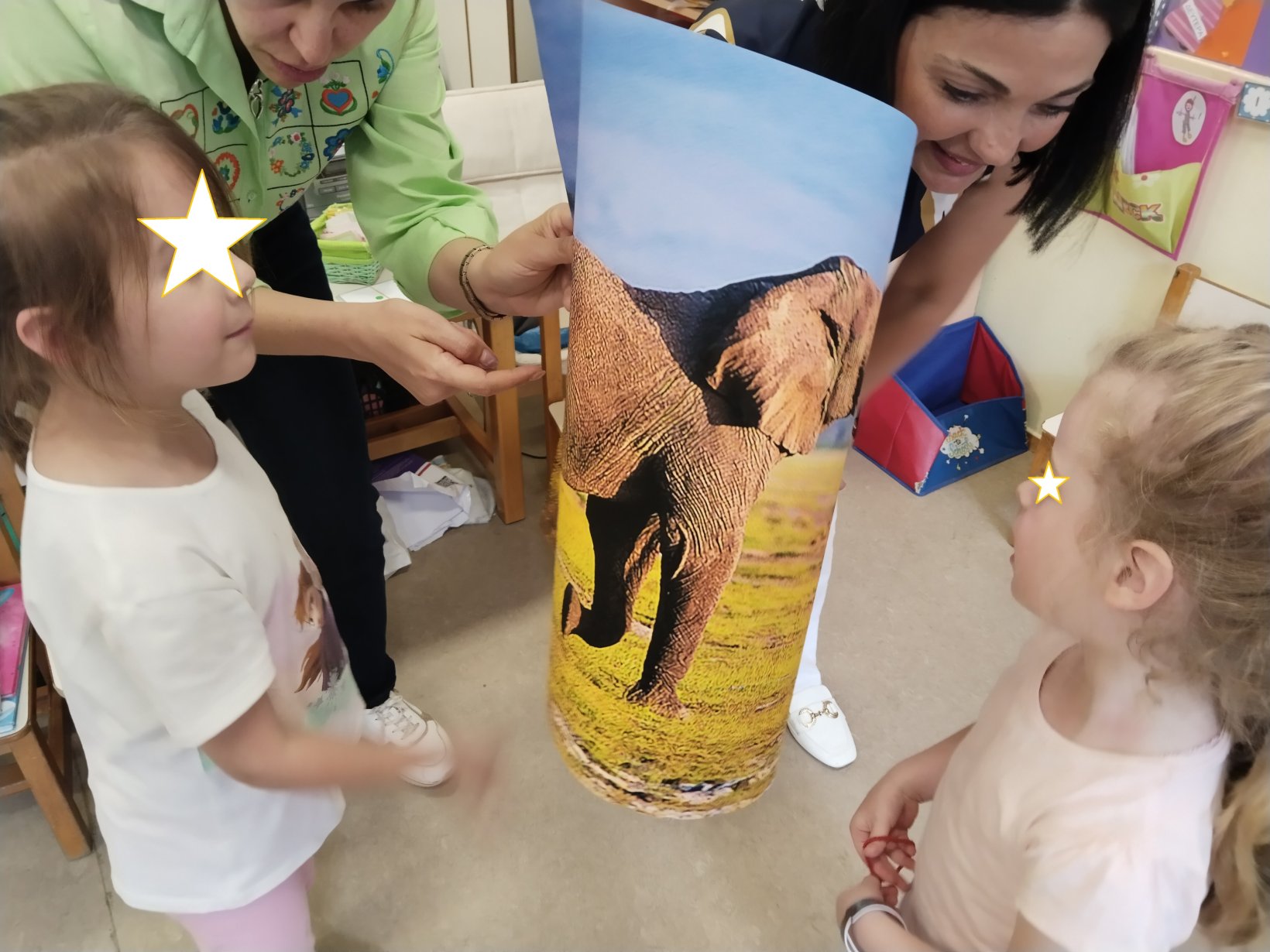 Αρχικά είχαν μια μεγάλη αφίσσα με έναν ελέφαντα την οποία μας την άφισσαν .Η μία ψυχολόγος ε΄χε κλείσει τα μάτια και η άλλη παρουσίασε την αφίσσα.Ρώτησε τα παιδια τι βλέπουν και είπαν έναν ελέφαντα.Στην συνέχεια εβαλε την αφίσσα πολύ κοντά στα μάτια της άλλης ψυχολόγου και όταν τα παιδιά της είπαν να τα ανόιξει έλεγε με σιγουρια ότι βλέπει έναν καφε τοίχο.’Ετσι διαδραματίστηκε ένα δρώμενο όπου τα παιδιά επέμεναν ότι αυτό είναι ελέφαντας και εκείνη καφέ τοίχος.Στη συνέχεια της είπαν να πάει πιο πίσω προς την πλευρά των παιδιών και το τε καρτάλαβε ότι είχαν δικιο.