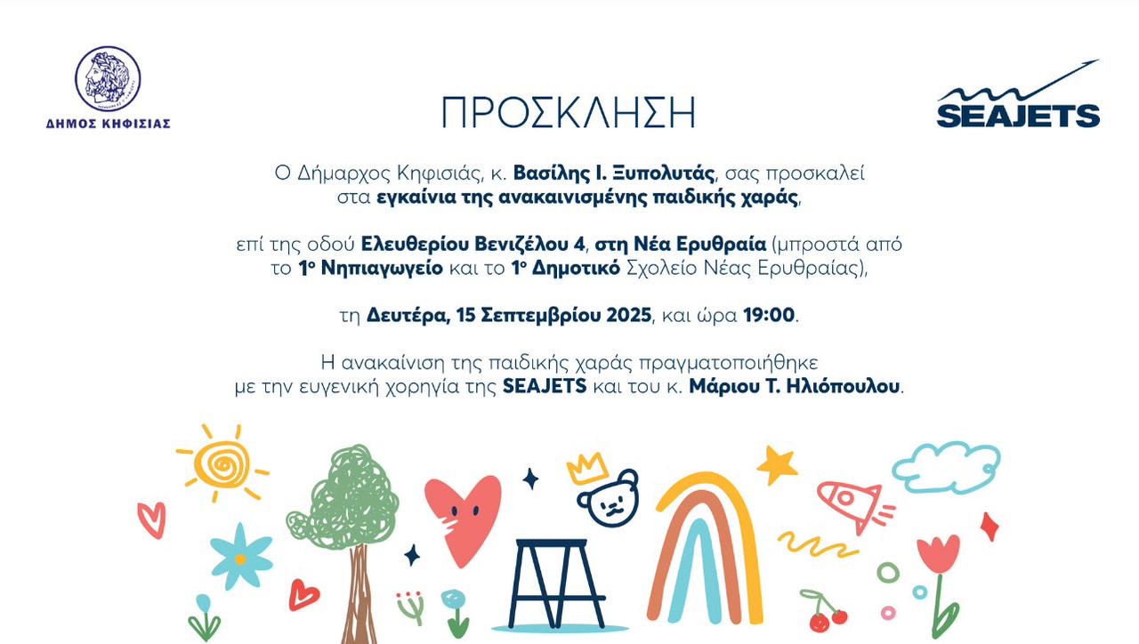 Την Δευτέρα 15 Σεπτεμβρίου τα εγκαίνια της ανακαινισμένης παιδικής χαράς επι της οδού Ελευθερίου Βενιζέλου 4 στην Νέα Ερυθραία